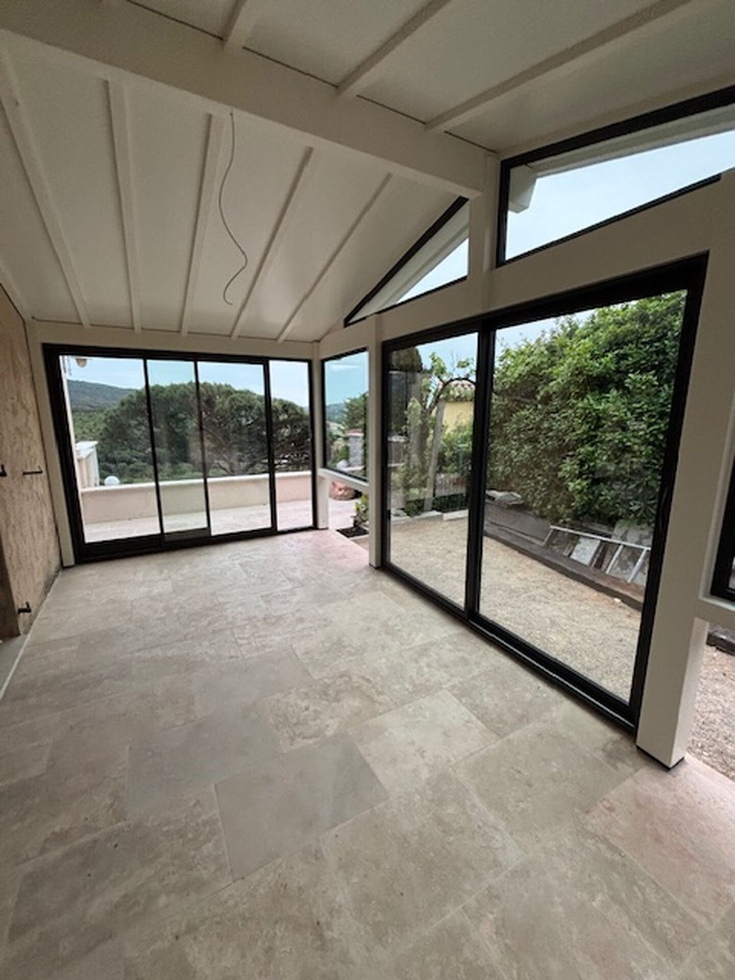 Samana Var Extension a récemment réalisé une véranda aluminium sur mesure, issue de la collection Horizon, sur la commune de Fréjus. Conçue pour s’intégrer harmonieusement à l’habitation existante, cette création met en avant une conception technique maîtrisée et un assemblage soigné. La structure repose sur un châssis aluminium laqué blanc 9010, reconnu pour sa grande résistance mécanique, sa stabilité dans le temps et sa tenue face aux conditions climatiques du littoral varois.