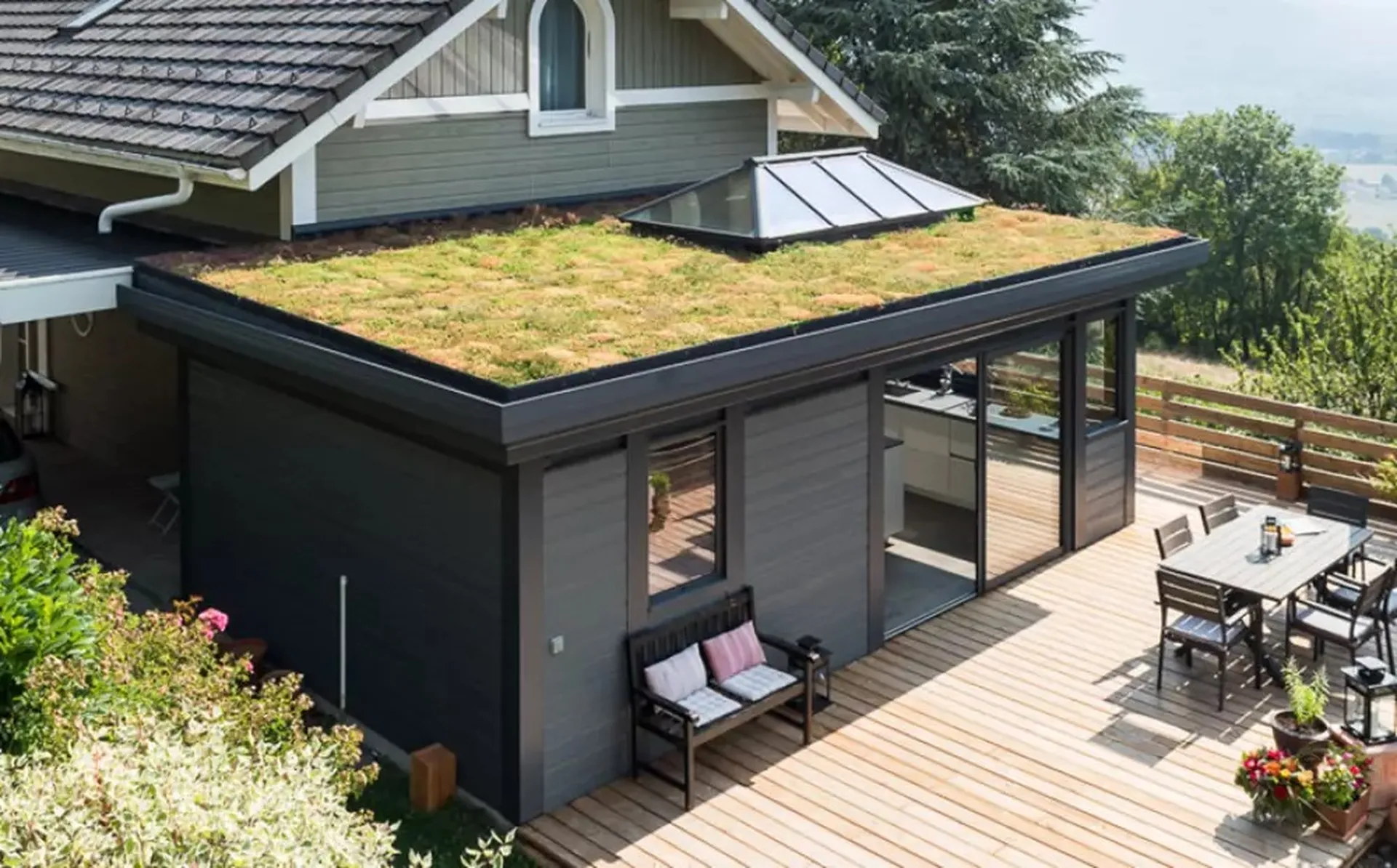 Son toit plat peut accueillir des puits de lumière ou dômes vitrés, apportant une luminosité naturelle incomparable. C’est la solution idéale pour créer une pièce de vie spacieuse et lumineuse, ouverte sur le jardin.
